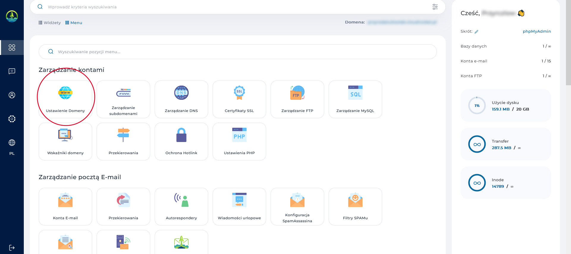 Domena techniczna widoczna jest po zalogowaniu w panelu DA w sekcji "Zarządzanie kontami" -> "Ustawienie Domeny":